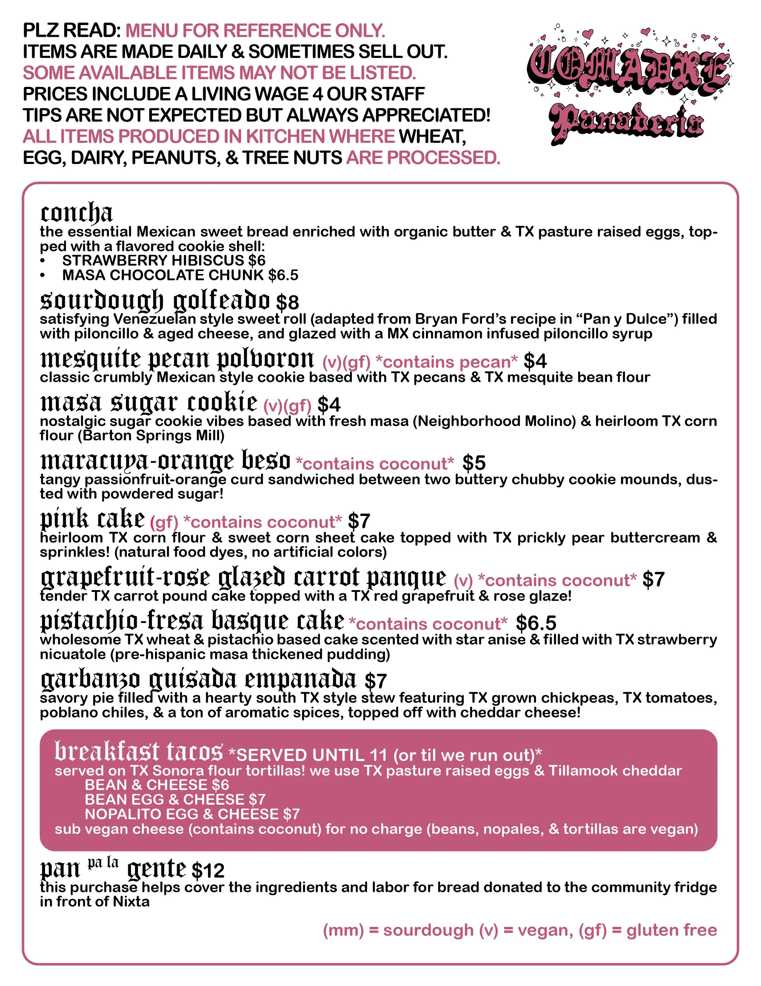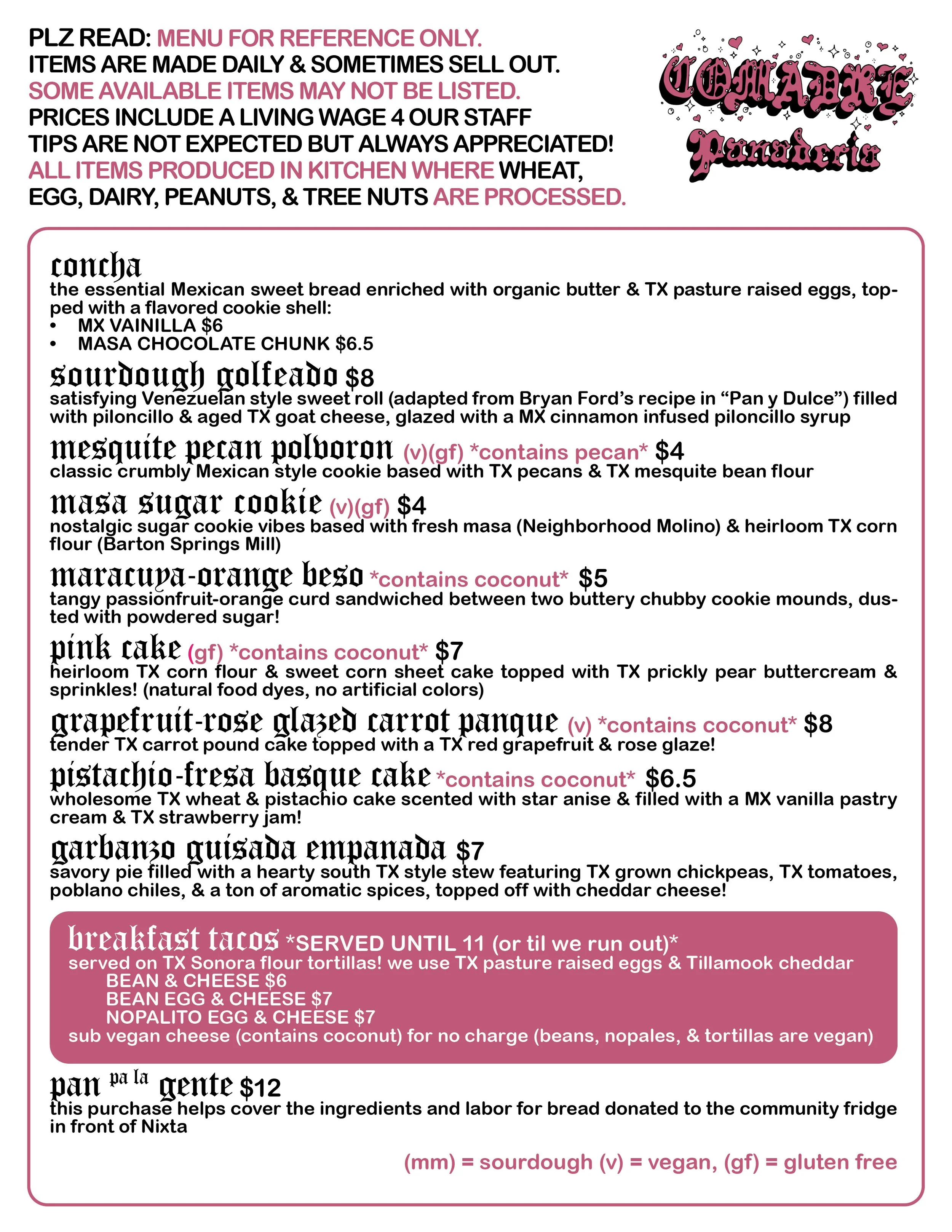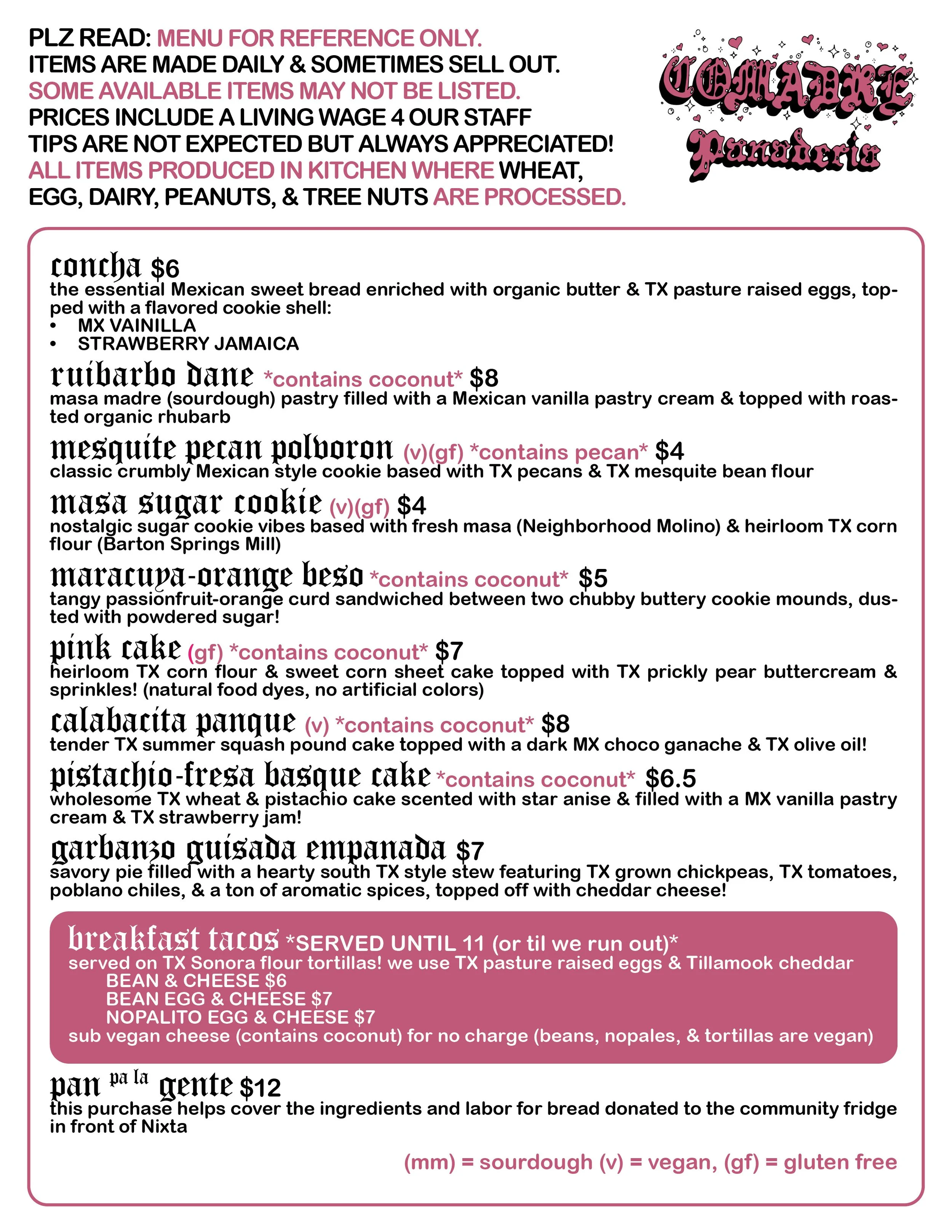Comadre Panadería is a Mexican American bakery created by Mariela Camacho: daughter of Mexican immigrants, professional baker of almost two decades, former punk/hardcore musician, and lover of dogs. Our breads are the culmination of years of hard work, ancestral knowledge, and whole, nutrient rich, responsibly farmed and harvested (and tasty) ingredients.