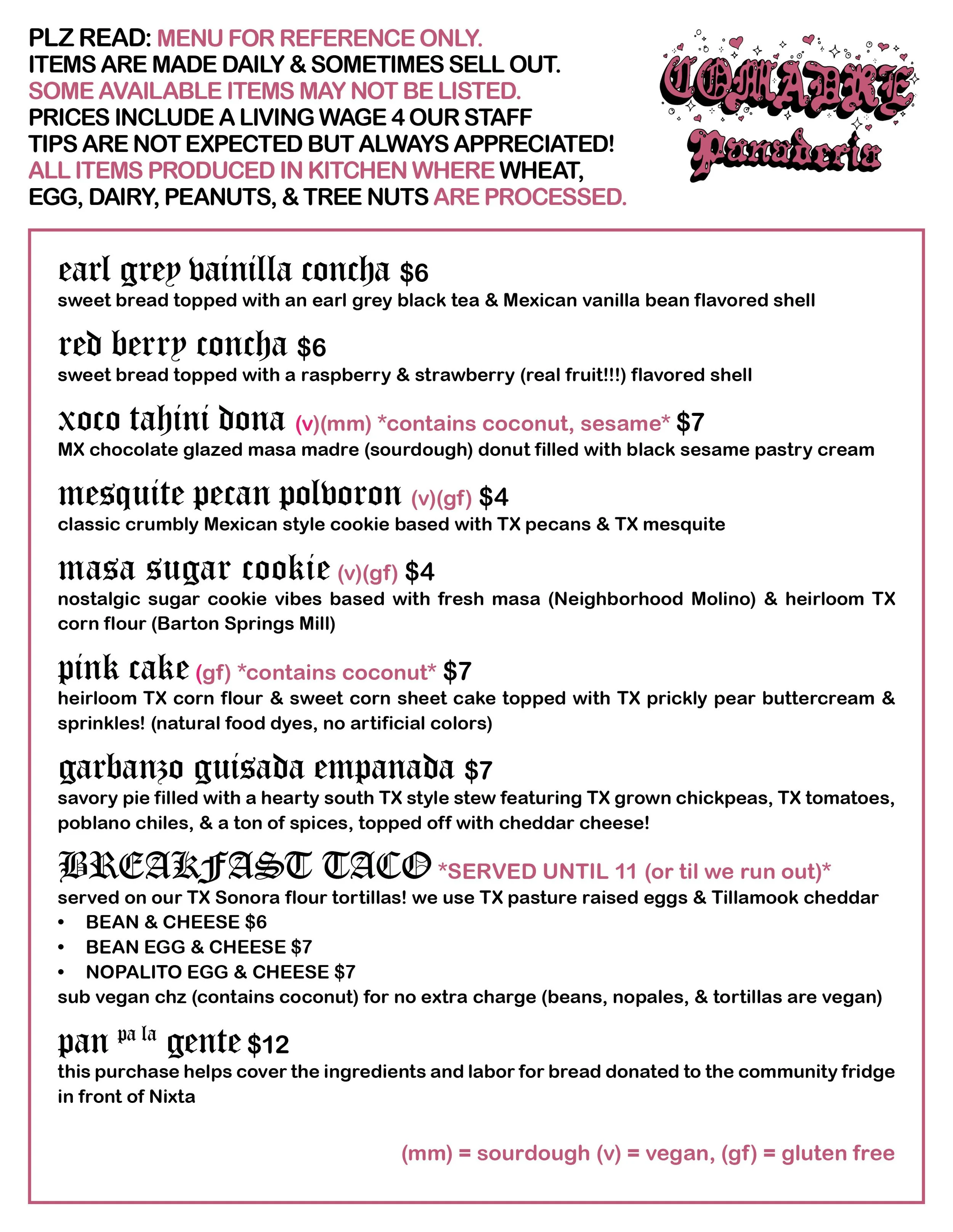 NOTE: MENU FOR REFERENCE ONLY — ITEMS ARE BOUND TO SELL OUT!